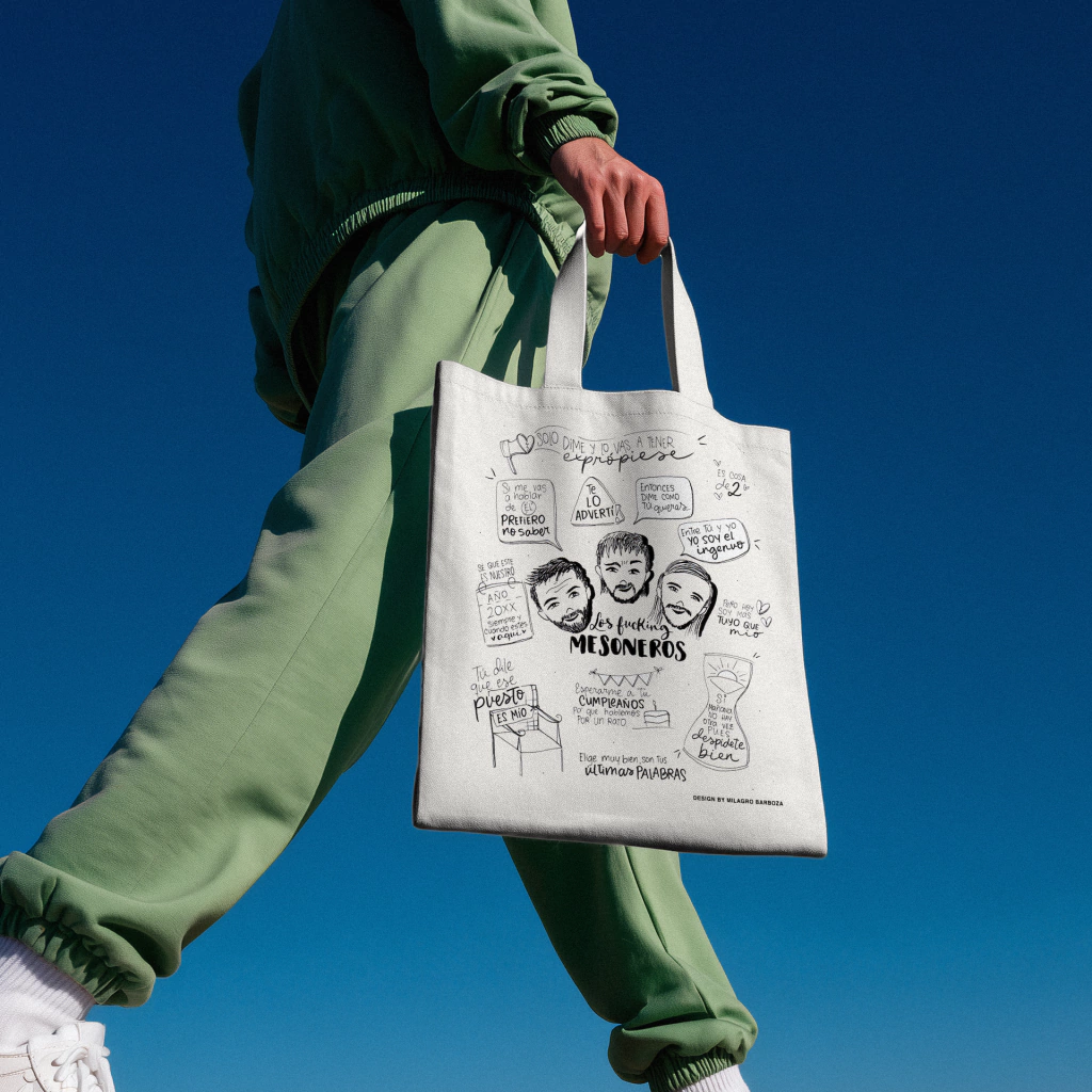 Descubre la exclusiva tote bag de Los Mesoneros, una pieza única que lleva una ilustración original de Milagro Barboza, con partes icónicas de las letras más memorables de la banda. Confeccionada en tela de manta cruda de algodón y mide 35 x 40 cm, perfecta para acompañarte a donde vayas.